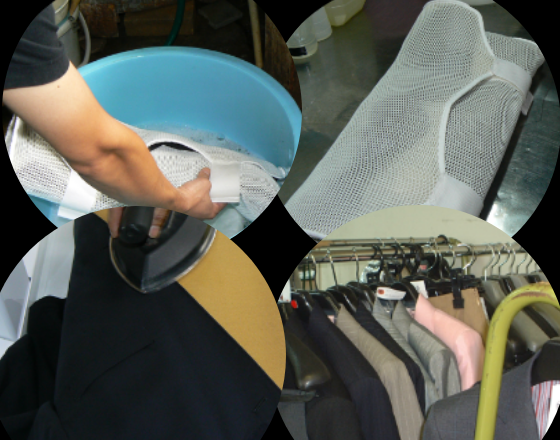 水溶性の汚れには弱いのです。汗や汗系の臭いは落ちません。「水洗いクリーニング」は、衣類の縮みが心配されますが、特殊な洗剤を使用することと、過程での絶妙な温度調整で極力縮みを無くし、後の手仕上げプレスで完全な仕上がりを見せます。水洗いされているので、臭いもなくすっきりとしていますし、汗はもちろん雨などの汚れも落ちます。生地を最良の状態に保つ唯一の方法です。
